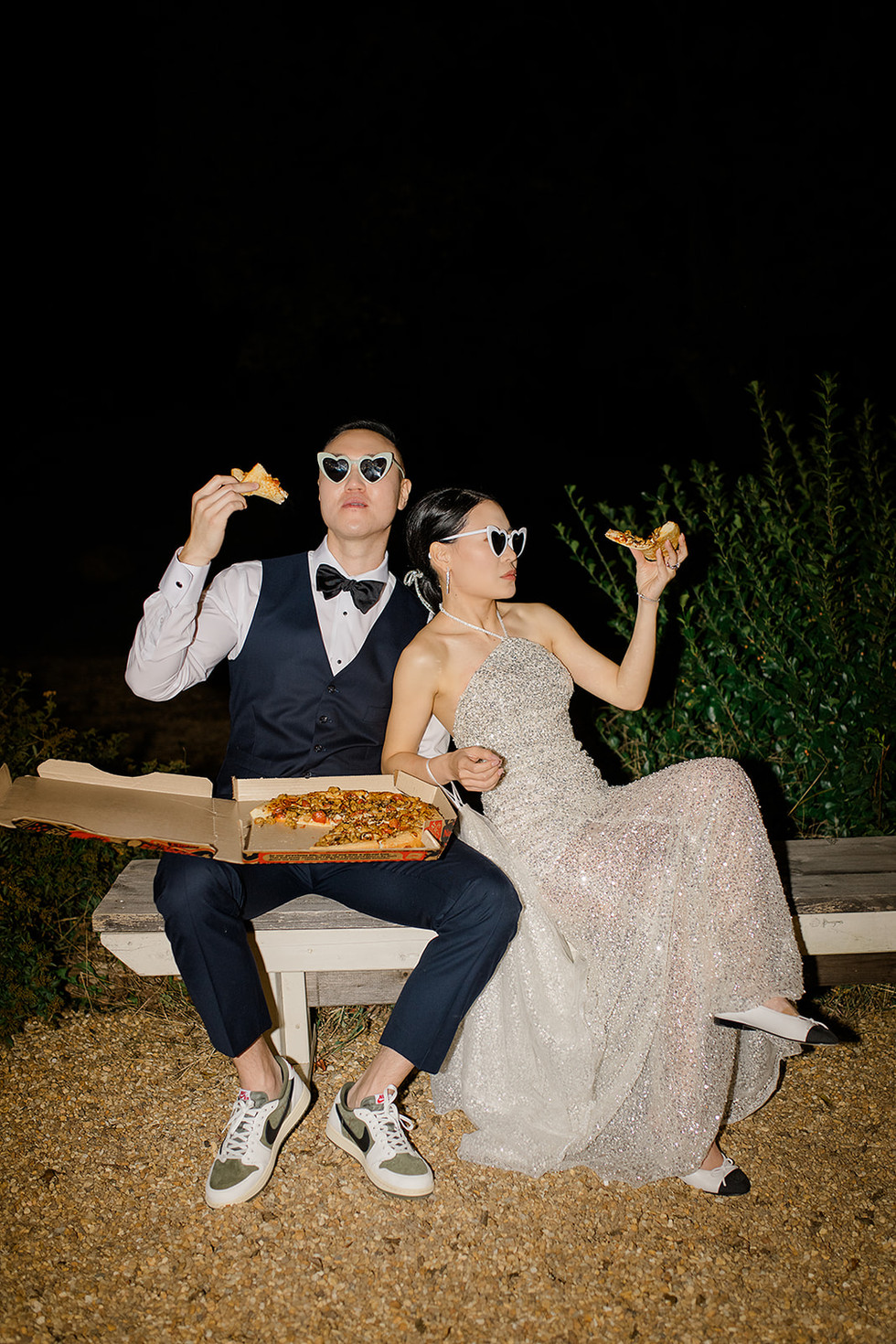 Some of my favorite touches for this gorgeous Old Hollywood-style wedding included a fortune cookie seating chart, a stunningly sparkly reception look, and late night Pizza Hut delivered for guests!